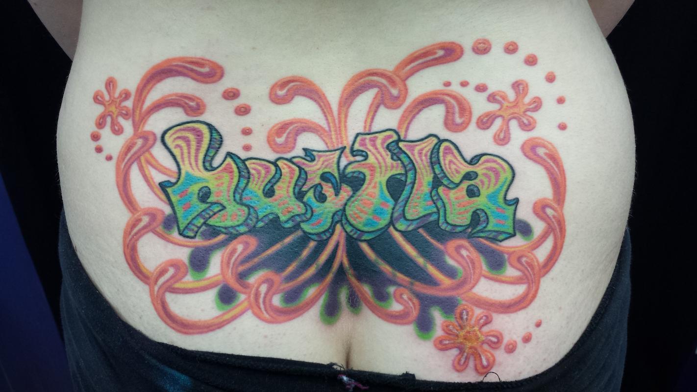 Cover-up of a previous lower-back tattoo with graffiti-style lettering.