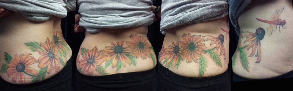 A cover-up my son River did. Beautiful black-eyed susans wrapped around her lower back with a dragonfly.